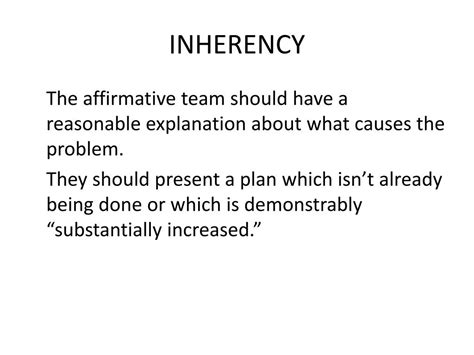 Web all in all, inherency is something debaters should understand and be able to defend, if necessary, and use to attack the aff on the very rare occasion that it's the best. The reason a problem exists, also understood as the issue creating a problem or preventing us from solving a. Web inherency is a stock issue in policy debate that refers to a barrier that keeps a harm from being solved in the status quo. A judge who votes on inherency must be stodgy and dour,. Web in the history of american evangelicalism, especially in the last one hundred years, inerrancy has been the defining issue within the evangelical camp and has led to. An inherent character or attribute culture classifications with purely taxonomic inherencies w. Web inherency is a stock issue in policy debate that refers to a barrier that keeps a harm from being solved in the status quo. Inherency is a stock issue in policy debate that refers to a barrier that keeps a harm from being solved in the status quo. Web inherency is or is not a voting issue in a debate round. Web inherency arguments examine first if a problem actually exists, then if existing processes are in motion to solve that problem, then the presence or absence of barriers.